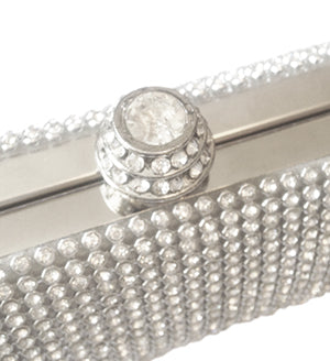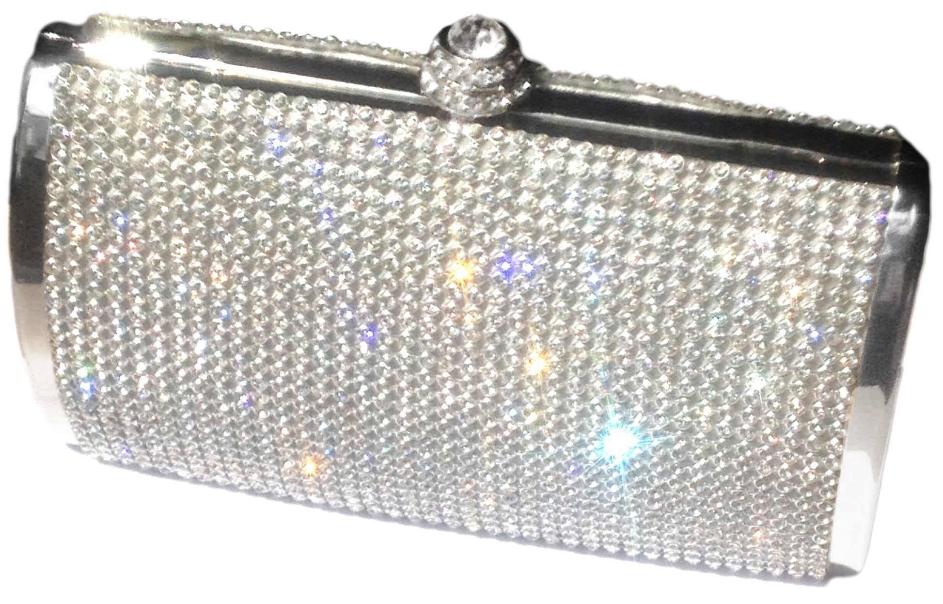 This beautiful sparkling clutch bag is covered with a multitude of crystals on the front and back. The sides are secured in a silver toned metal. This clutch bag has a solid exterior, the interior has a soft inner lining.
