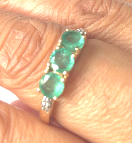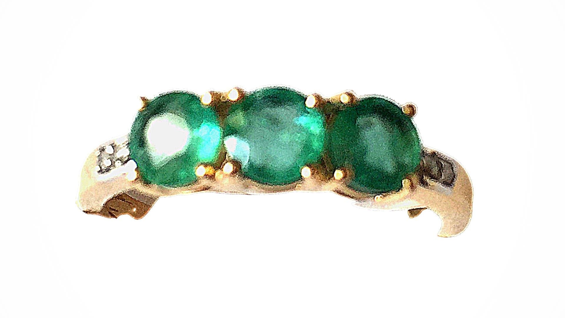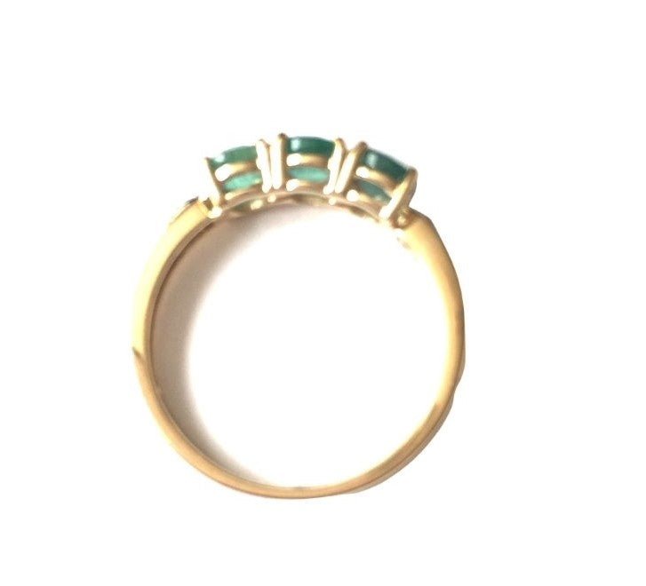 A fabulously eye-catching ring comprised of a trilogy of spectacularly gorgeous green emeralds in a circular movement with dazzling diamonds that dance in sparkle on either side. This exquisite design sits upon a solid 9K Gold ring.