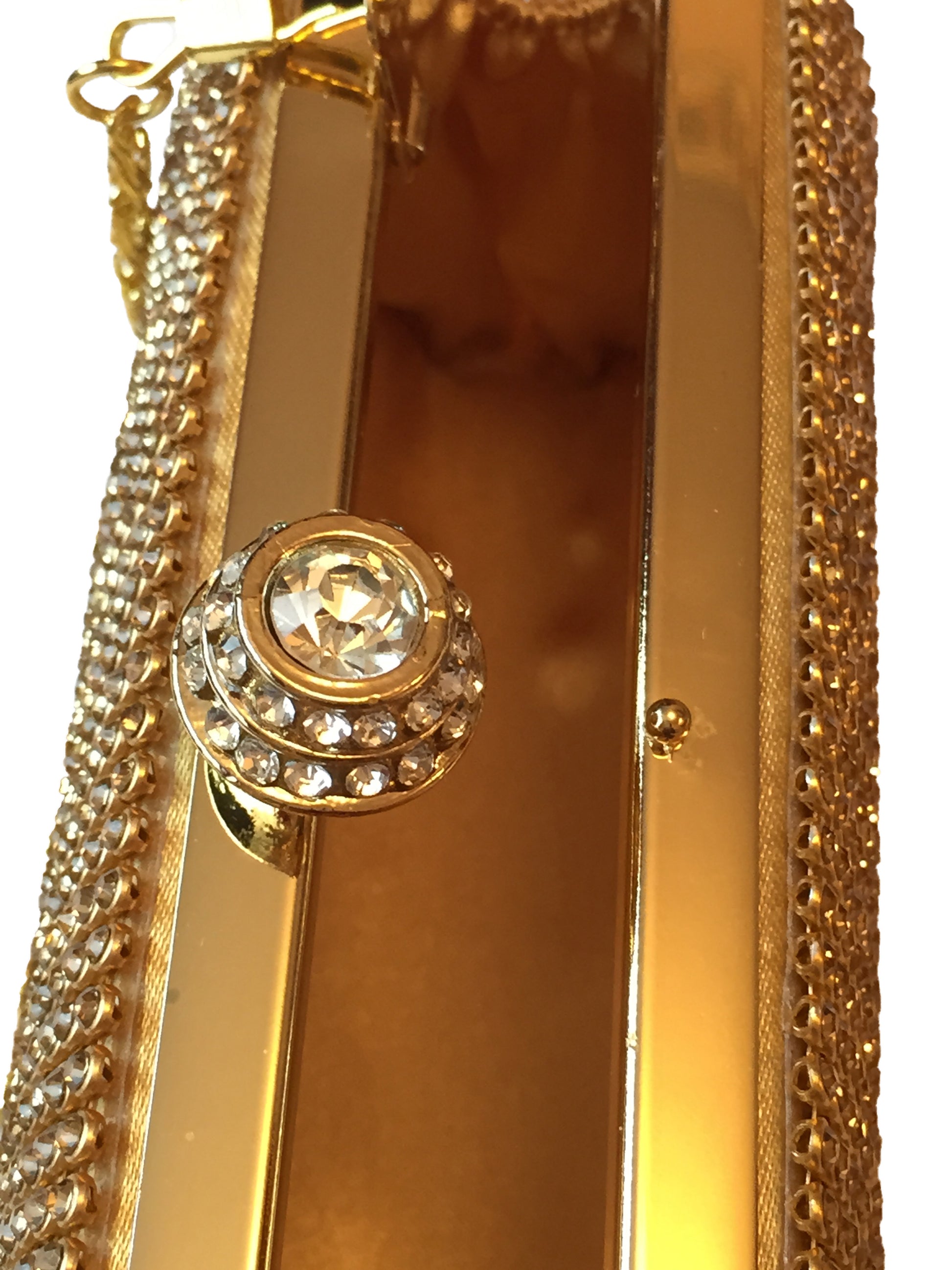 This clutch, which will hold your necessities, is securely fastened with a clasp which is embellished with a crystal surround, made up of one large crystal that is surrounded by smaller crystals.